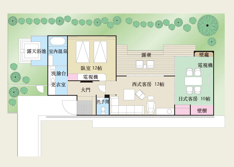 露天浴池及室內浴池都注滿具有療癒效果的泉水;挑高的天花板設計,令人怡然自得,從客廳及臥室,都能玩賞庭園的旨趣。我們能夠保證,在這個有著穩重感傢俱室內裝潢,以及50吋的大型電視等設備,會為各位貴賓帶來一段非常充實的入住時光。※距本館有一段距離