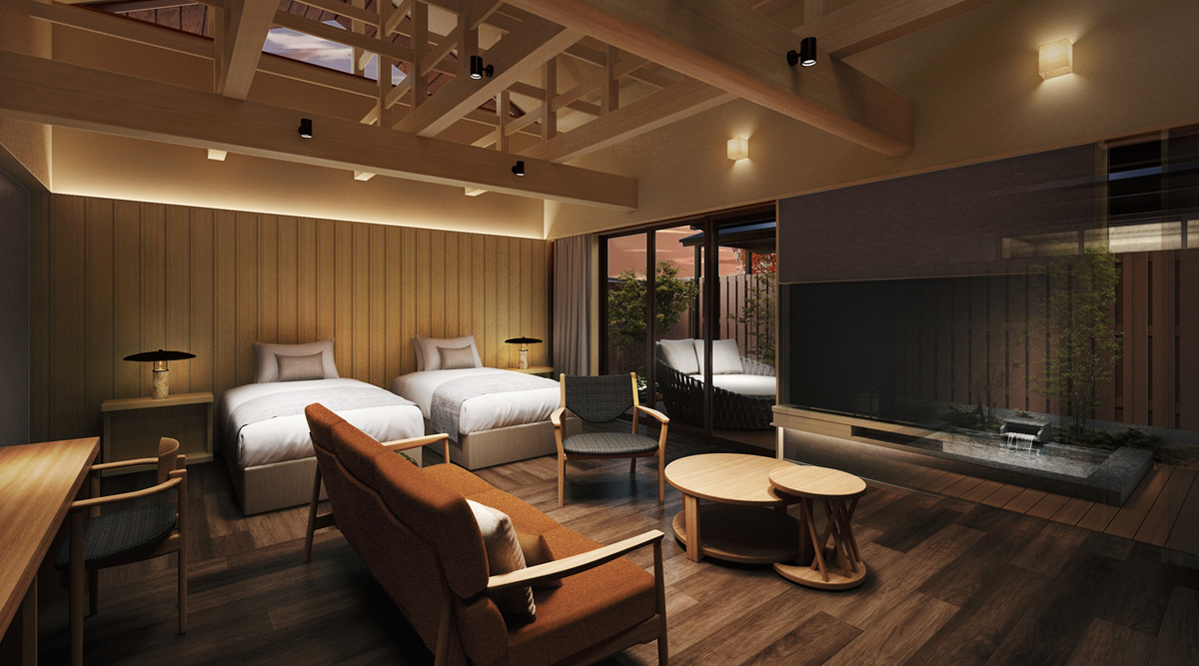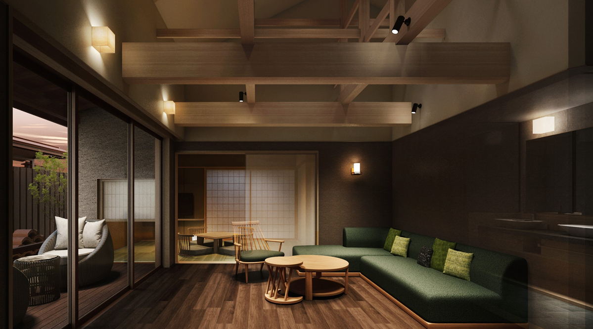 名湯を湛えた専用露天風呂と内湯、ゆったりとした天井高のリビング・寝室からは、庭園の趣きをお楽しみいただけます。